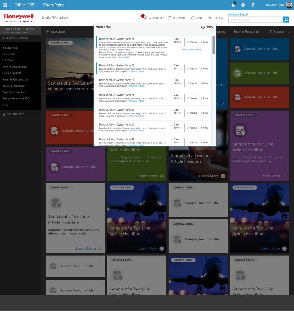 Key insights provided in voice of customer and usability sessions led to the creation of the “Action Hub”. The action hub would consolidate the list of actions that are sourced from different source systems such as Concur, ITIM, SAP and would present them to the user in a list form in chronological order. The Action Hub would be present in the form of a badge app icon on the DWP that would display the number of notifications for user actions. Users would have the ability to approve, decline or take other actions that they are accountable for from the Action Hub. The Action Hub would write user actions to the source systems.